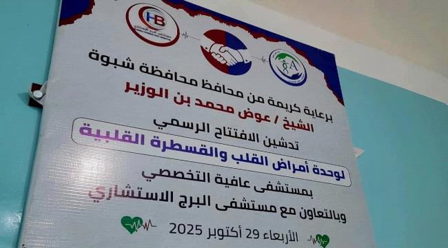 في خطوة طبية متقدمة تعكس مسار التنمية والاستقرار الذي تشهده محافظة شبوة في مختلف القطاعات، افتتح الأمين العام للمجلس المحلي بالمحافظة عبدربه هشله ناصر، وبرعاية كريمة من محافظ المحافظة، رئيس المجلس المحلي، عوض محمد بن الوزير، صباح اليوم وحدة القسطرة القلبية والعلاجية بمستشفى عافية التخصصي بمدينة عتق.