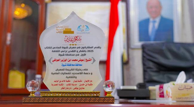وفي ختام اللقاء، قامت قيادة فرع هيئة الكتاب وممثلو دور النشر المشاركة بتكريم المحافظ بن الوزير بدرع تذكاري، عرفاناً برعايته الكريمة ودعمه المباشر الذي كان له الدور الأبرز في إنجاح هذه النسخة المتميزة من المعرض، مؤكدين أن هذا الدعم رسّخ مكانة شبوة على خارطة الفعاليات الثقافية محلياً وإقليمياً.