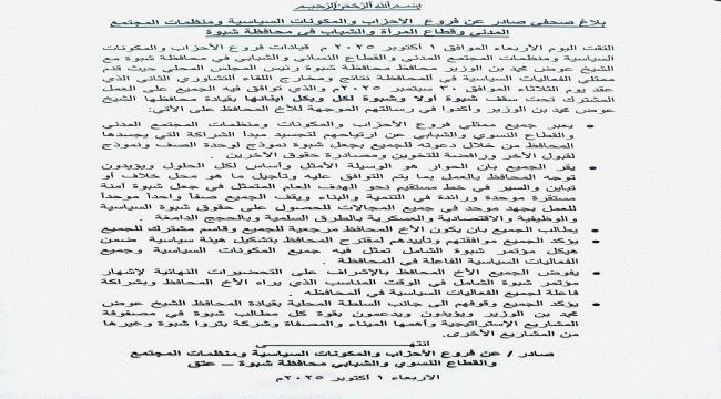 واختتمت الفعاليات السياسية والمجتمعية بيانها بالتأكيد على وقوفها الثابت إلى جانب قيادة السلطة المحلية ممثلة بالمحافظ الشيخ عوض محمد بن الوزير، والعمل معه بروح الفريق الواحد من أجل حماية حقوق أبناء شبوة وتحقيق مصالحها العليا.