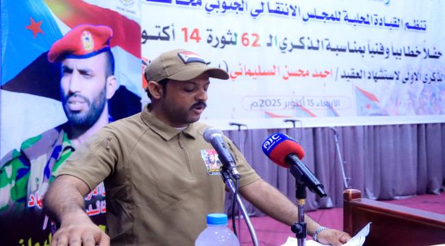 احتفت محافظة شبوة، اليوم الأربعاء، برعاية كريمة من الرئيس القائد عيدروس الزُبيدي، رئيس المجلس الانتقالي الجنوبي، بالذكرى الـ62 لثورة 14 أكتوبر المجيدة، وتخليدًا للذكرى الأولى لاستشهاد العقيد أحمد محسن السليماني، أركان اللواء الأول دفاع شبوة السابق، بإقامة حفلٍ خطابي في مدينة عتق، بحضور ومشاركة عضو هيئة رئاسة المجلس، رئيس فريق التوجيه والرقابة الدكتور سالم علي القميري.