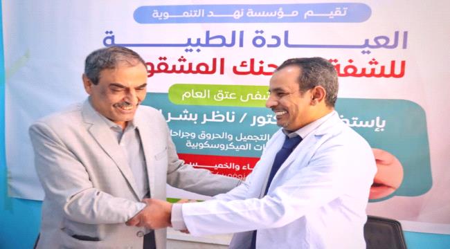 دشّن الأمين العام للمجلس المحلي بمحافظة شبوة، عبدربه هشلة ناصر، اليوم الأربعاء، عملية التسجيل للمخيم الطبي المجاني المخصص لإجراء عمليات جراحية لتشوهات الشفة الأرنبية وسقف الحلق، وذلك في مستشفى شبوة العام للأمومة والطفولة، تمهيدًا لتنفيذ المخيم الأسبوع المقبل في مستشفى البرج بمدينة المكلا بمحافظة حضرموت، بتمويل من منظمة "سمايل ترين" الدولية، وإشراف وتنفيذ مؤسسة نهد التنموية.