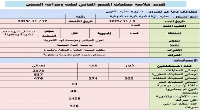 برعاية واهتمام المحافظ عوض بن الوزير، وبجهود حثيثة تعكس حرص قيادة المحافظة على دعم وتجويد الخدمات الصحية، اختُتِم اليوم في مستشفى شبوة العام للأمومة والطفولة المخيم الطبي الإنساني لإزالة المياه البيضاء وتركيب العدسات، والذي نُفِّذ خلال الفترة من 9 إلى 17 نوفمبر 2025م، وسط حضور طبي لافت وإقبال مجتمعي كبير للاستفادة من خدماته النوعية.