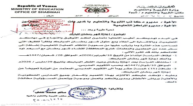 اصدر مكتب التربية والتعليم بمحافظة شبوة تعميم، قضى ببدء اجازة شهر رمضان المبارك لجميع مدارس التعليم الاساسي والثانوي بتاريخ 16فبراير الموافق 28شعبان، على ان تستأنف الدراسة بعد شهر رمضان بتاريخ 29مارس الموافق 10شوال بحسب التقويم المدرسي.