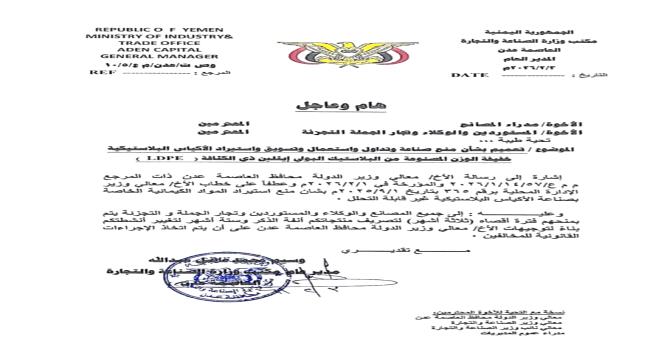 وجاء في نص تعميم مدير عام مكتب الصناعة والتجارة بعدن العميد وسيم العُمري، أن هذا الإجراء يأتي استناداً إلى جملة من التوجيهات الصادرة عن معالي وزير الدولة محافظ العاصمة عدن عبدالرحمن شيخ ووزارة الإدارة المحلية، والتي منعت بموجبها استيراد المواد الكيميائية الداخلة في صناعة مثل هذه الأكياس غير القابلة للتحل.