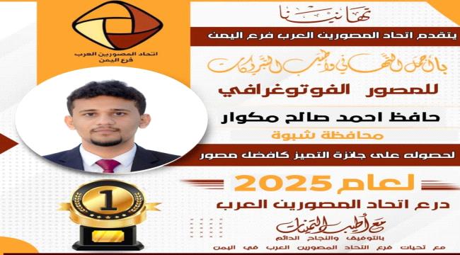 بارك مكتب الإعلام بمحافظة شبوة فوز المصور الفوتوغرافي حافظ أحمد صالح مكوار بجائزة أفضل مصور لعام 2025، وذلك ضمن فعاليات المسابقة السنوية السادسة التي ينظمها اتحاد المصورين العرب، حيث منحت لجنة التحكيم التابعة للمكتب التنفيذي للاتحاد مكوار هذا اللقب تقديراً لتميزه وإبداعه الفني، إلى جانب منحه الميدالية الذهبية ودرع الاتحاد.